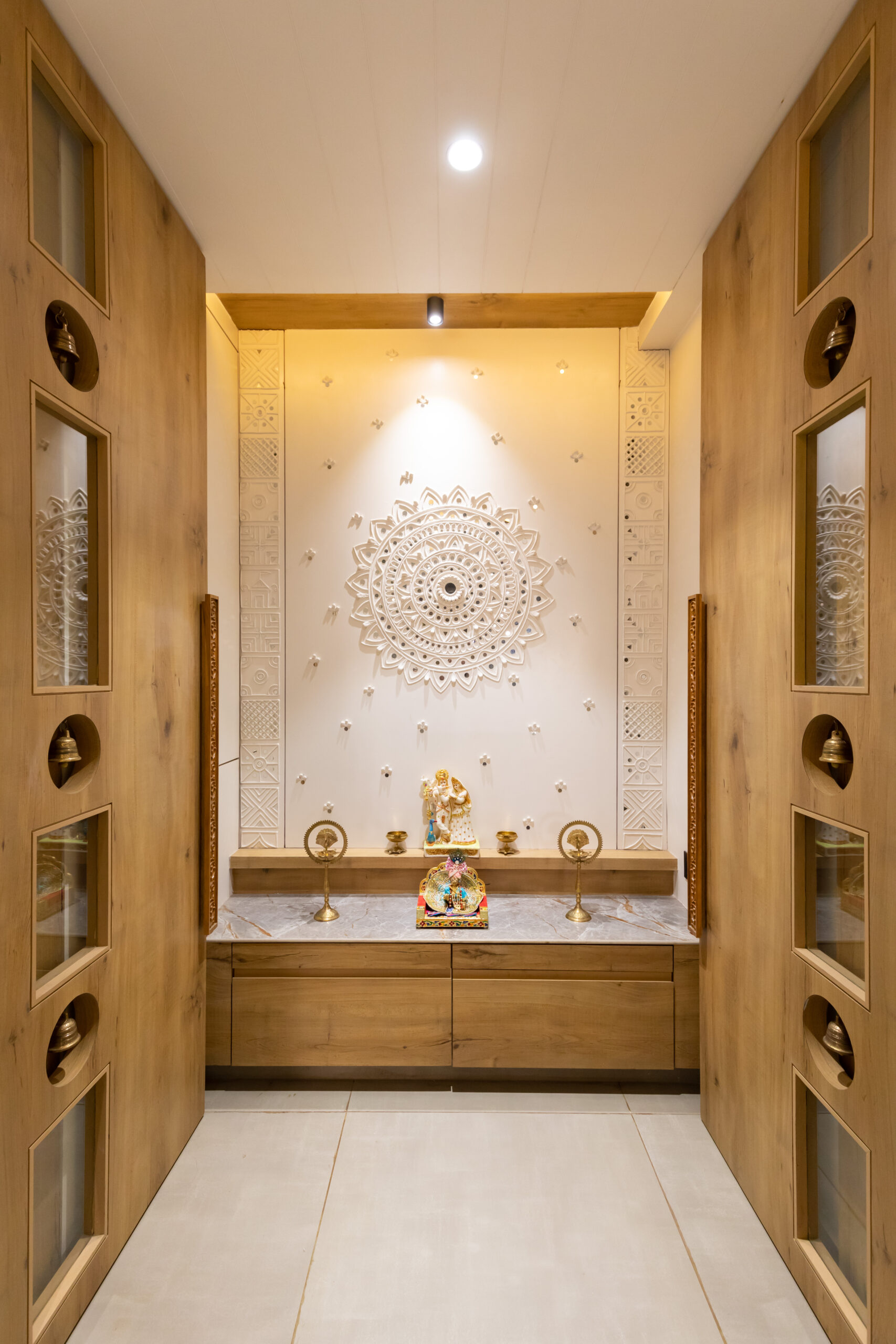 To bring in a sense of cultural rootedness, we designed the puja room with traditional mud mirror work, handcrafted by local artisan.